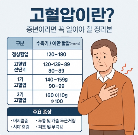 이 글에서는 고혈압 수치를 정확히 해석할 수 있는 기준표와 함께, 수치별 의미와 관리법까지 한눈에 정리해드립니다.