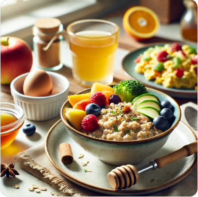 • 아침: 삶은 달걀 + 현미죽 + 오이무침