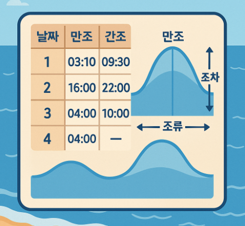 쉽게 말해, 언제 바닷물이 가장 많이 들어오고(만조), 가장 많이 빠지는지(간조)를 알 수 있게 해주는 것이죠.