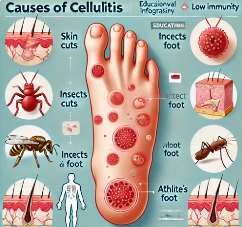 봉와직염 실제 증상 표현 (다리 부종, 홍반)세균 감염 경로 설명 다이어그램 → 상처 → 세균 침투 → 염증 진행 과정