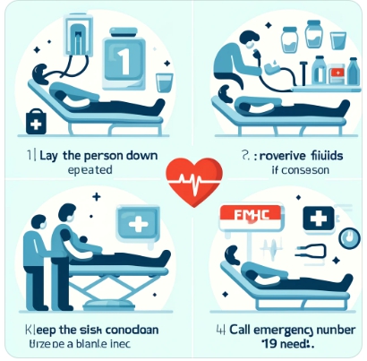 환자가 어지러움을 느끼거나 쓰러졌다면, 주변의 위험한 물건을 치우고 누운 자세를 취하게 하세요.